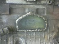 Довольно часто встречаются задачи установки стальных заплат на проломленных участках, там где отсутствуют фрагменты чугунного корпуса. Для этого края отверстия в чугунном корпусе наплавляют электродами Castolin 2-44, после чего подгоняют стальную пластину по форме повторяющую форму получившегося отверстия. Сварку стальной заплатки с наплавленной кромкой чугунного корпуса выполняют электродами Castolin Xuper 2240.