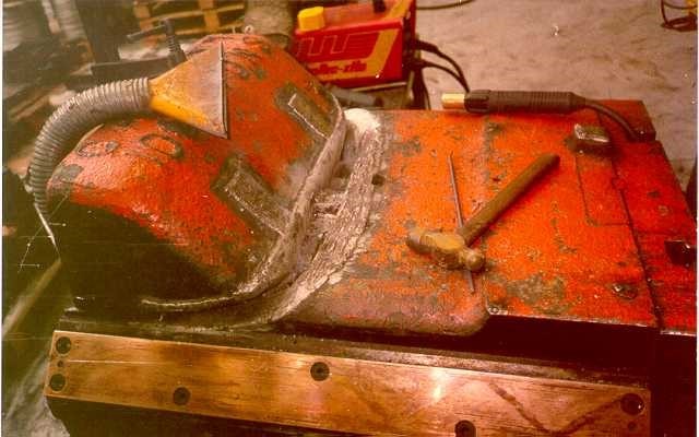 Разделку трещин при подготовке детали к сварке рекомендуется проводить с помощью специальных разделочных электродов Chamfertrode 03 (сварка на постоянном токе) или Chamfertrode 04 (на постоянном или переменном токе). Применяя эти электроды, мы решаем сразу несколько задач: удаляем изношенный металл, выжигаем масло и примеси из околошовной зоны, снижаем опасность порообразования в наплавленном металле. В результате строжки получается U-образная разделка, которая по сравнению с V-образной (абразивный инструмент) позволяет значительно до 30% экономить сварочный материал. Кроме того производительность при разделке строжкой выше, чем при работе абразивным инструментом в 4-5 раз.